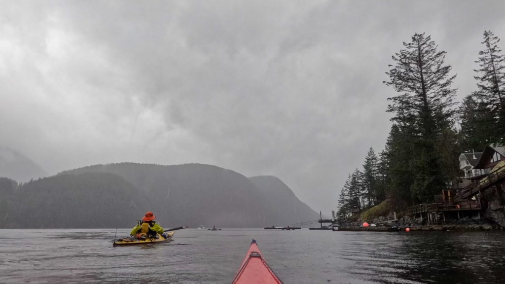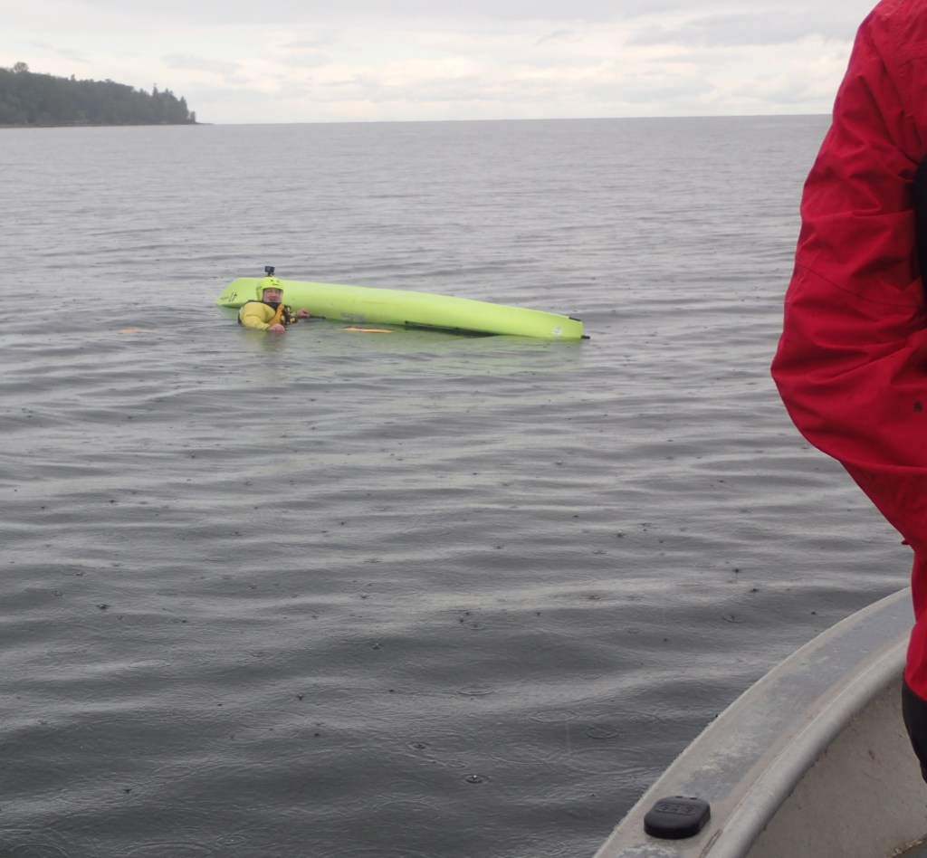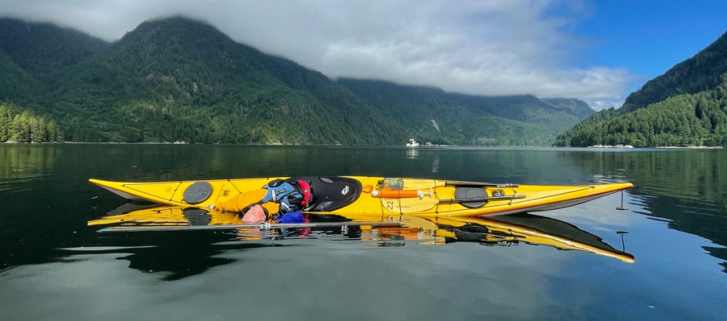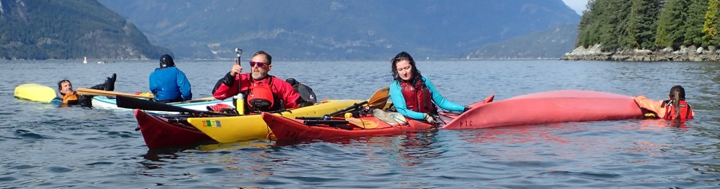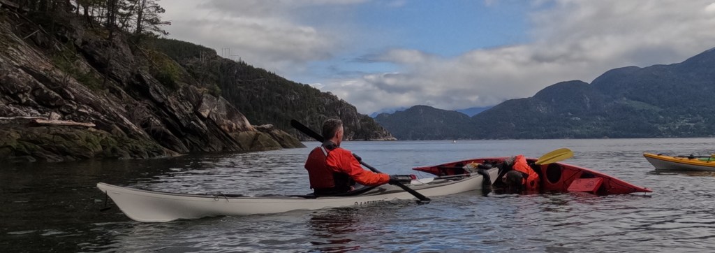 Just before landing at Porteau, Mike initiated the final exercise of the course: the “all in” where the entire class capsizes simultaneously, then helps one another reboard.