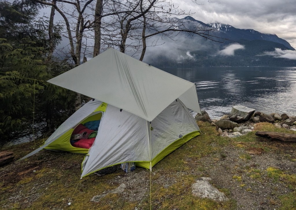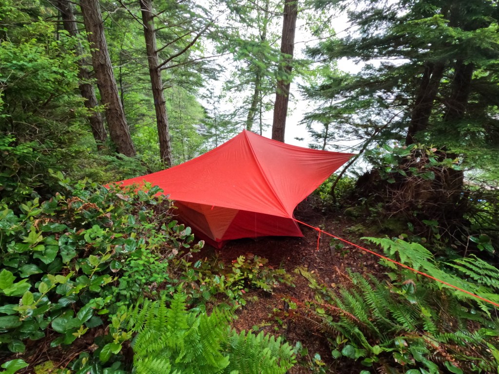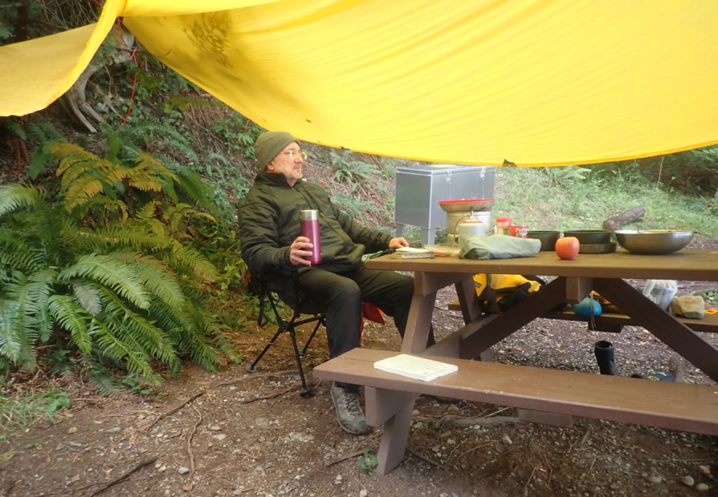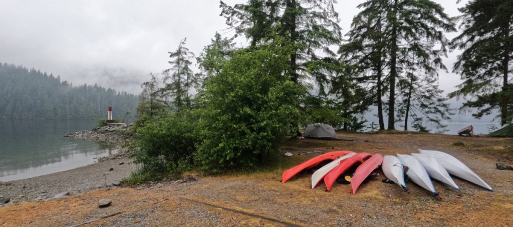 As we landed, showers were drifting in, so one of the first orders of business was to set up a dry central meeting area. I’ll plead guilty to being proud, verging on vain, of my tarpology skills, so I began rigging a roof over the most accessible picnic table. As we’d loaded our boats at Porteau Cove that morning, Mike had politely expressed that the tarp poles I was packing would probably be unnecessary, since he knew of a conveniently located tree at the site. As it turned out, the arborologist who regularly checks the site had decreed the removal of that particular tree since Mike’s last visit. So my precious poles were not a waste of space. I lashed one to a handy root ball to hold it firmly upright, and used it to suspend one end of the tarp ridgeline.