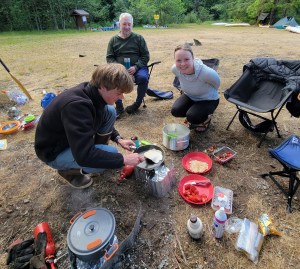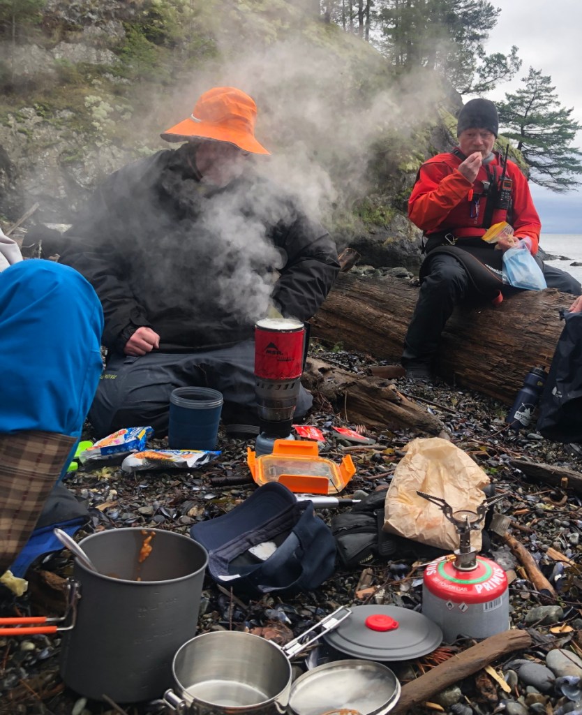 Since the weather was cool with occasional showers, once we’d landed for lunch at Islet View, I fired up my MSR Windburner to provide hot water for soup and tea. Over years of shoulder season touring, I’ve found alternating bites of any lunch with swigs of hot soup makes even cold sandwiches feel like a hot meal. Appropriately enough, the lunchtime learning topics included managing hypo and hyperthermia.
