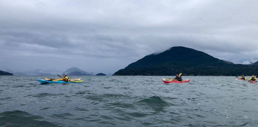 Our route, carefully planned prior to launch, took us east across Howe Sound to make landfall just north of Furry Creek, where we’d turn south to dogleg back to Porteau Cove. As the marine forecast had predicted, the southerly inflow was picking up nicely by the time we launched, so we had fine Level 2 conditions, or “Mike’s Delight” as I’m starting to call them: 1 to 2 foot seas with a high proportion of spilling whitecaps, all straight on our starboard sides, so we occasionally had to convert our forward strokes to slight sweep braces, or be ready to slap down a low brace.