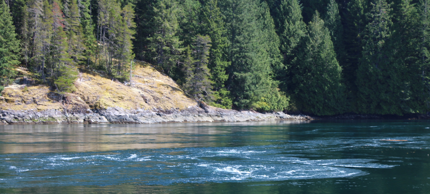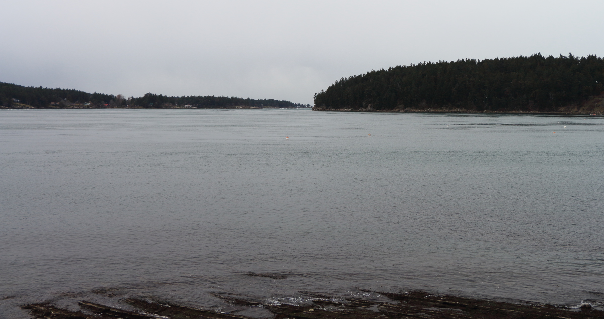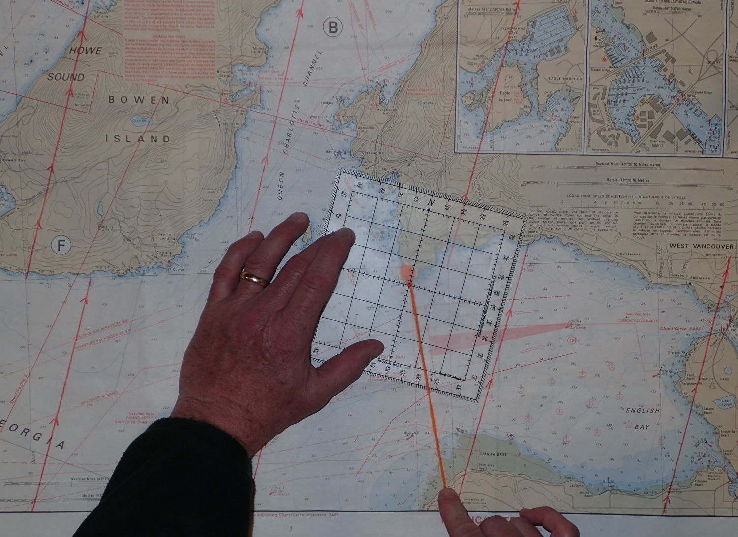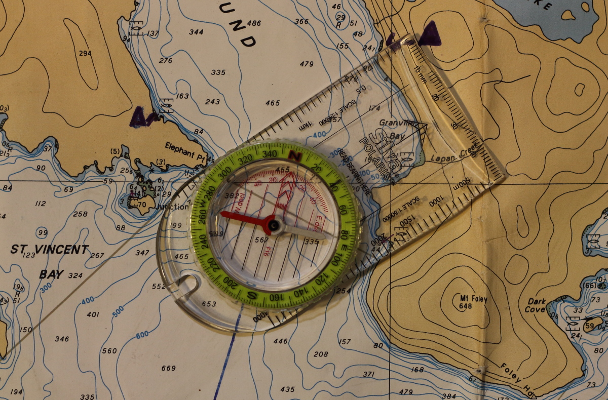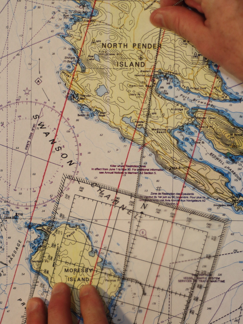 On the crossing, we practiced compass navigation, time-distance-speed calculations and the use of ranges. We made landfall just south of the Defence Islands, then turned north to handrail along the shore to Ts’itpsm (Zorro Bay).