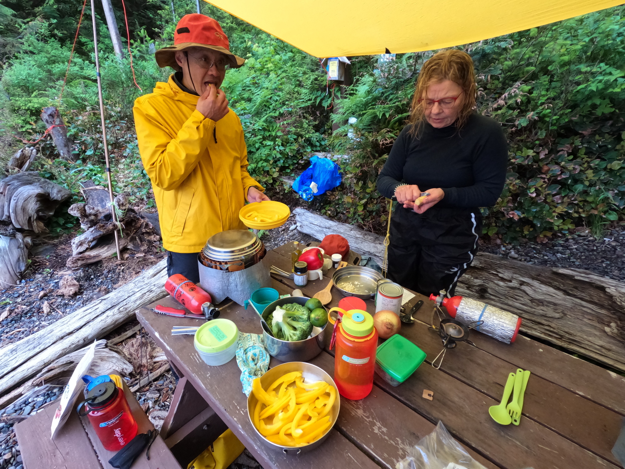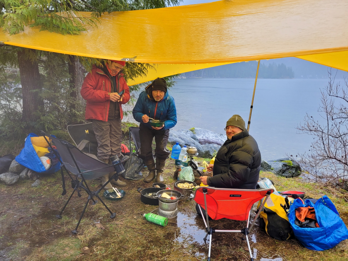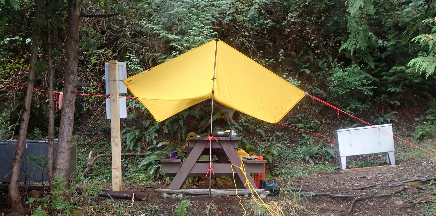 As we landed, showers were drifting in, so one of the first orders of business was to set up a dry central meeting area. I’ll plead guilty to being proud, verging on vain, of my tarpology skills, so I began rigging a roof over the most accessible picnic table. As we’d loaded our boats at Porteau Cove that morning, Mike had politely expressed that the tarp poles I was packing would probably be unnecessary, since he knew of a conveniently located tree at the site. As it turned out, the arborologist who regularly checks the site had decreed the removal of that particular tree since Mike’s last visit. So my precious poles were not a waste of space. I lashed one to a handy root ball to hold it firmly upright, and used it to suspend one end of the tarp ridgeline.