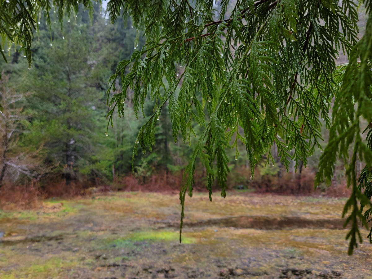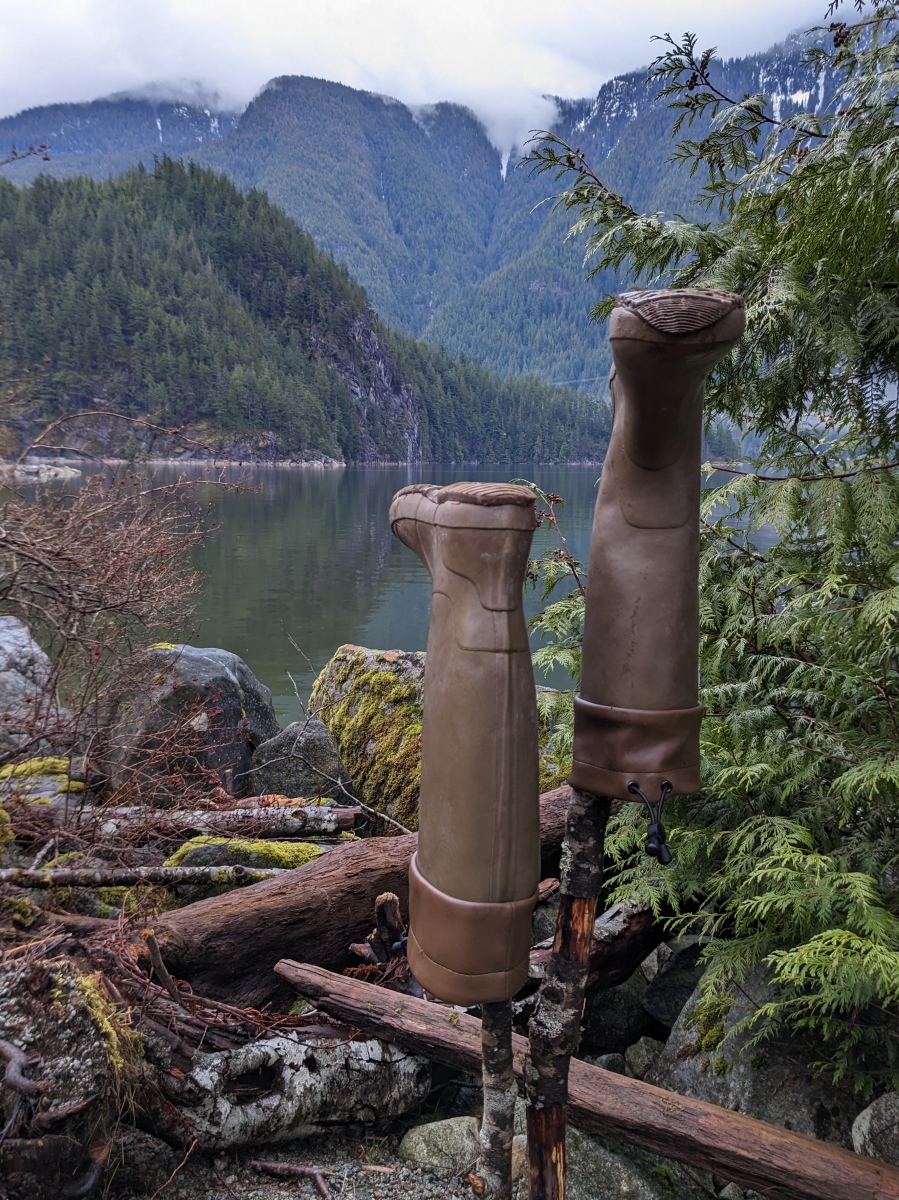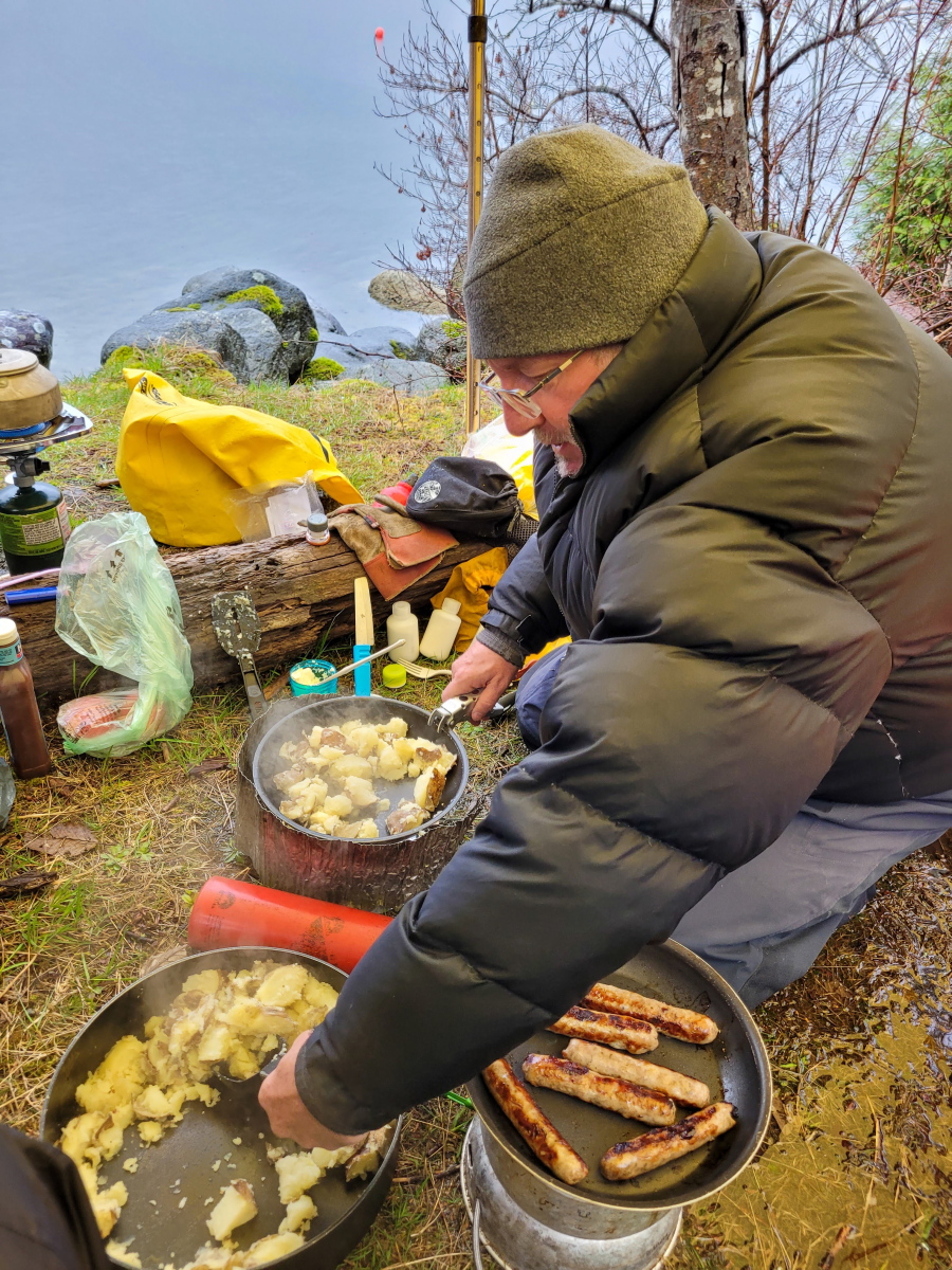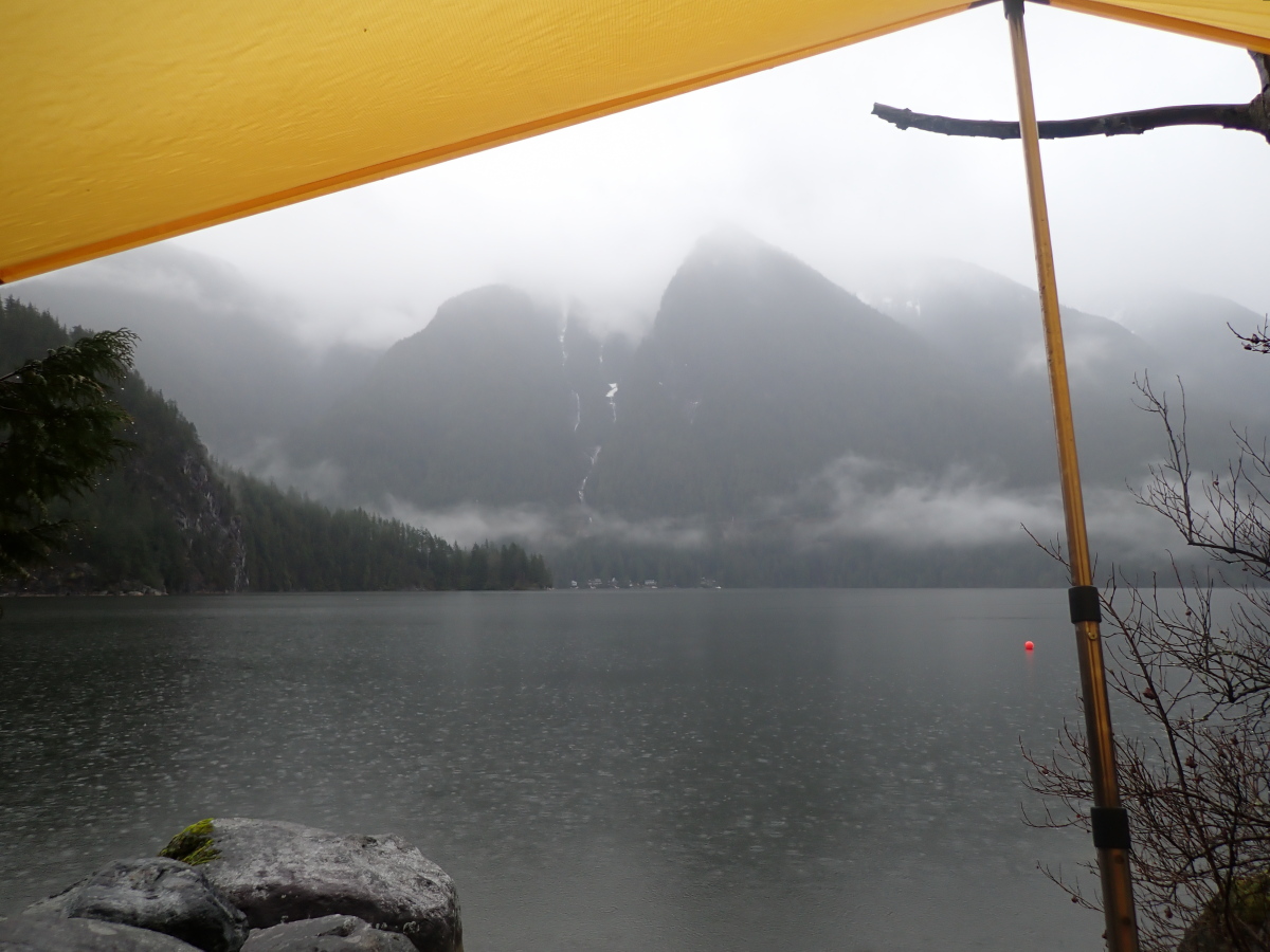 As we landed, showers were drifting in, so one of the first orders of business was to set up a dry central meeting area. I’ll plead guilty to being proud, verging on vain, of my tarpology skills, so I began rigging a roof over the most accessible picnic table. As we’d loaded our boats at Porteau Cove that morning, Mike had politely expressed that the tarp poles I was packing would probably be unnecessary, since he knew of a conveniently located tree at the site. As it turned out, the arborologist who regularly checks the site had decreed the removal of that particular tree since Mike’s last visit. So my precious poles were not a waste of space. I lashed one to a handy root ball to hold it firmly upright, and used it to suspend one end of the tarp ridgeline.