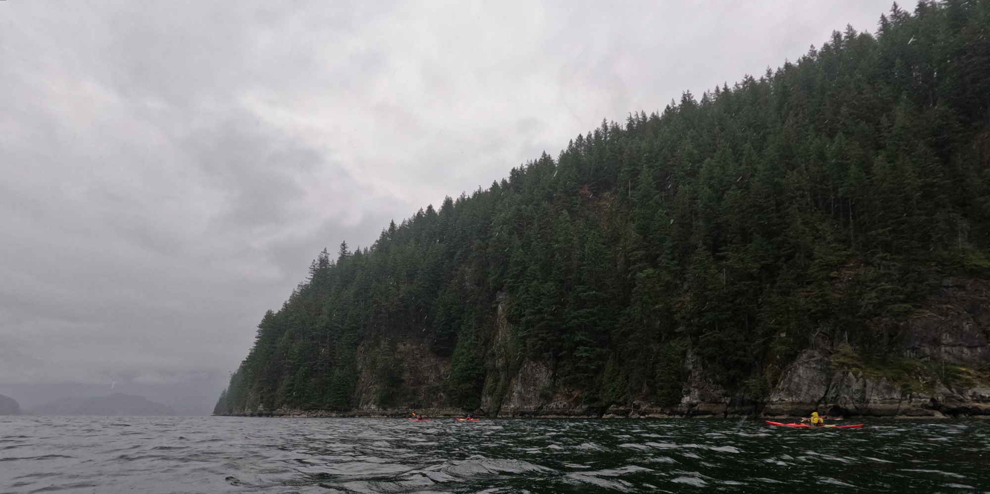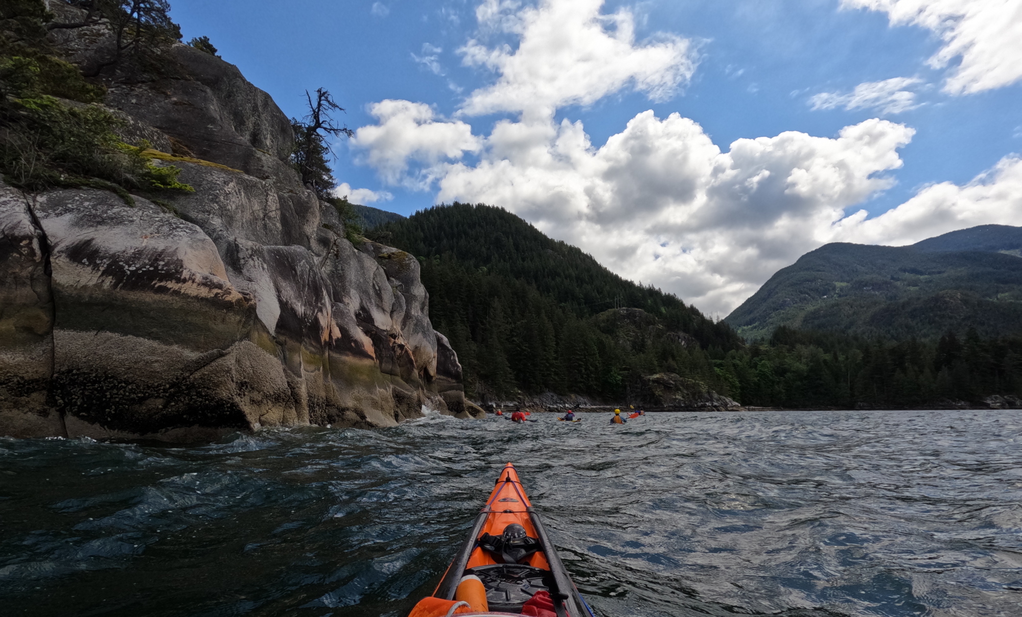 As we handrailed south down the shoreline to Porteau Cove, we deliberately hugged the cliffs, enjoying the rollercoaster ride as the clapotis pinged off the walls to create sharp peaks and valleys in the water.