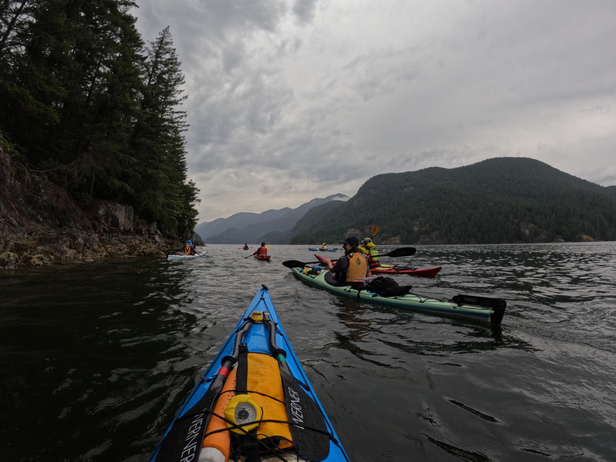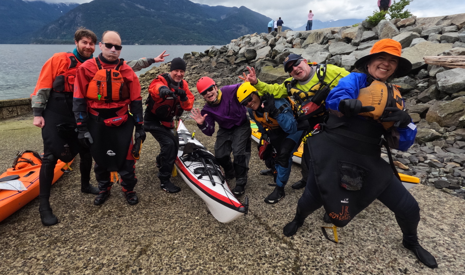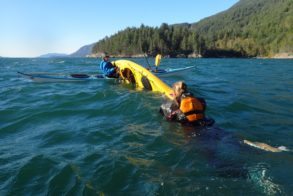 Just before landing at Porteau, Mike initiated the final exercise of the course: the “all in” where the entire class capsizes simultaneously, then helps one another reboard.