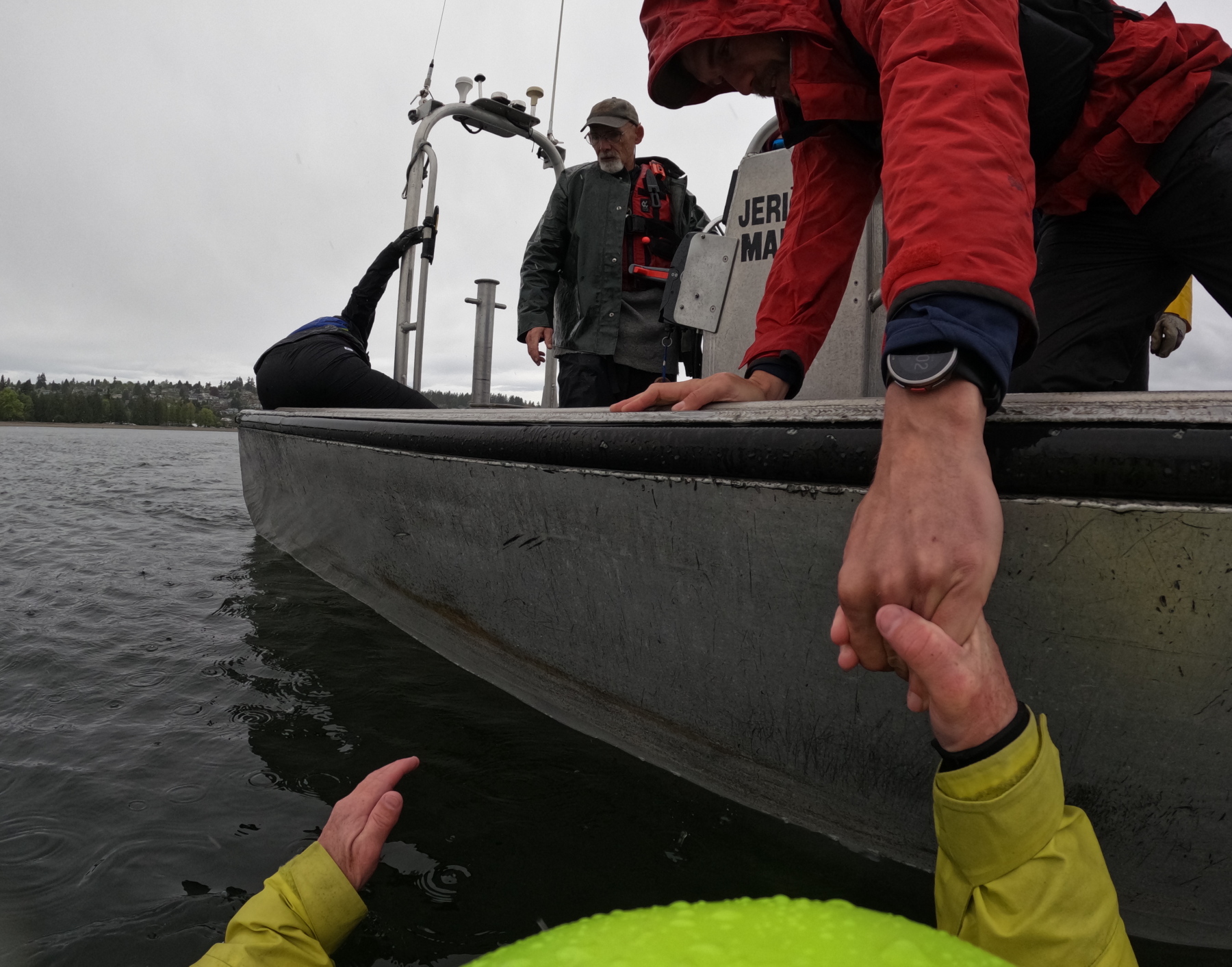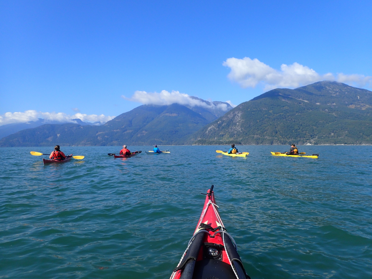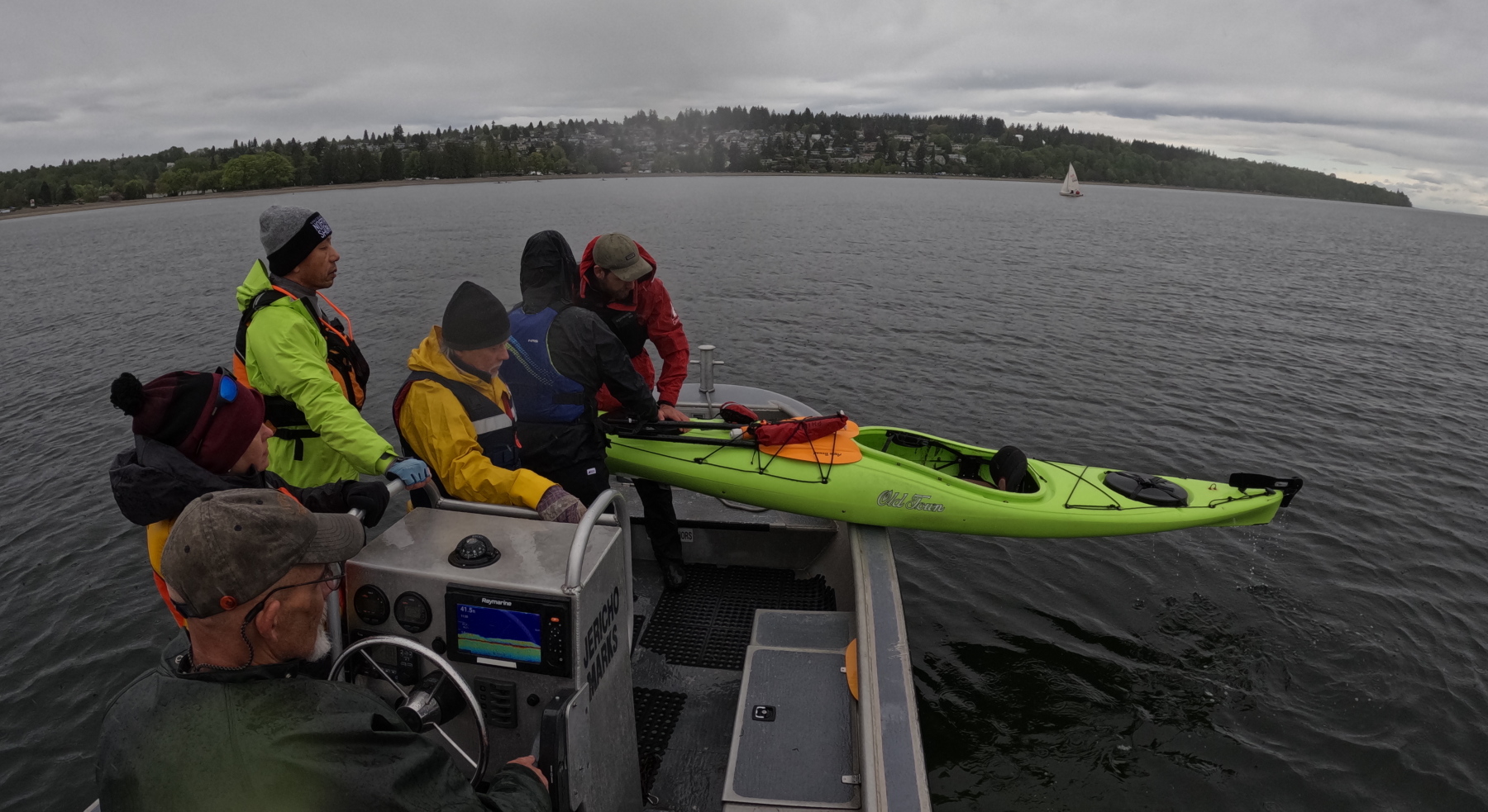 Just before landing at Porteau, Mike initiated the final exercise of the course: the “all in” where the entire class capsizes simultaneously, then helps one another reboard.
