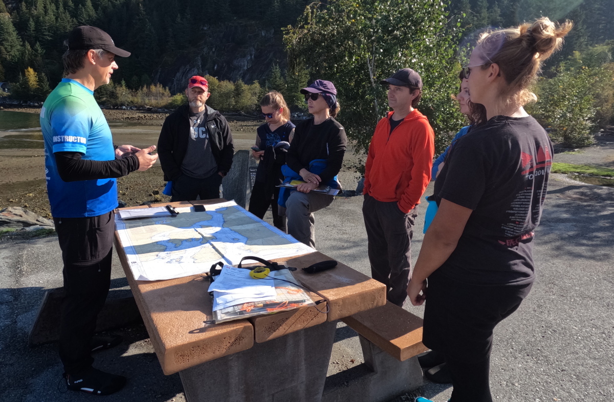 Mike and I rocked up to Xwawchayay (Porteau Cove) to find all the students already arrived and keen to launch. Before that however, we had a bit of learning and planning to do, and gathered round the nearest picnic table as an al fresco classroom.