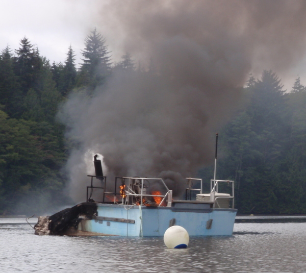 an anchored boat on fireAs I paddled past the appropriately named Burial Cove,  I spotted a boat on fire. A fishing guide in a runabout suggested this was simply some local’s way of disposing of a no-longer wanted vessel. (Environmental regulations sometimes are more of an urban theory than a reality in the backcountry.)