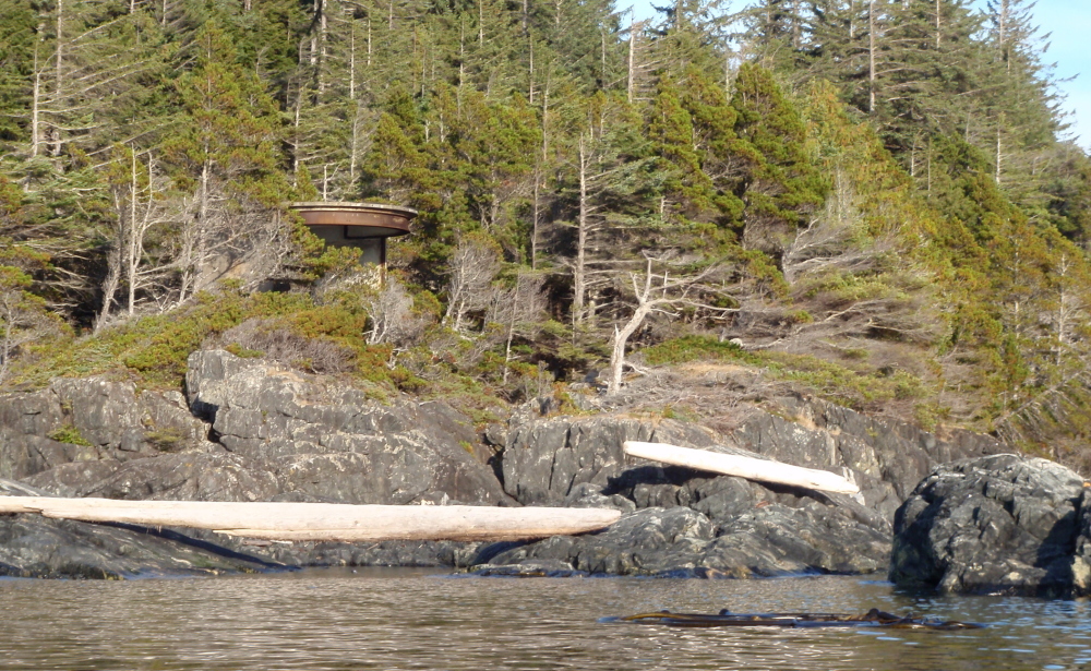 an old gun emplacement nestled in the treesI set out in the evening calm, not encountering any of the tide rips shown between the bay and Yorke Island (though there were some good eddies and upwellings in the shallow waters between Fanny, Clarence and Yorke islands). On a point at the N/W end of Yorke, I spotted a gun emplacement left over from the WWII installation there. As I drifted round the point, I nearly ran down a pair of seals, who promptly crash-dived.