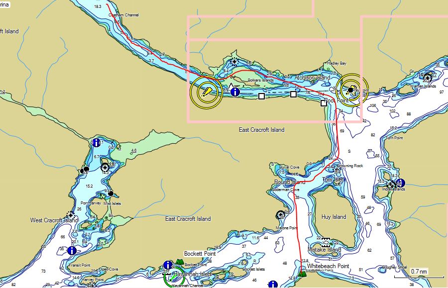 I waffled. I have a history with bears, and I had promised my wife I’d be especially careful on this trip. Prudence suggested it wasn’t smart to camp in an area with fresh bear sign. But I had little energy and couldn’t remember any alternate site nearby. The solution turned up literally at my feet: a lost map case on the beach, with a campsite indicated on nearby Yorke Island. I’d had it marked on my own map and entered in my GPS, but it had been hidden by a fold in my chart and a lapse in my memory.
