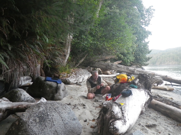 a kayaker cooks steak strips on a campstoveMy first day’s travel took me through Tribune Channel in an arc over the north and east sides of Gilford Island. It was one of the few days on my trip both wind and current were steadily with me — I even got to sail for a short time. As I’d hoped, I made the campsite just inside Kumlah Island for the first night. Supper was pretty fancy: fried strips of a steak that had kept by being frozen at the Paddler’s Inn, accompanied by instant mashed potatoes.
