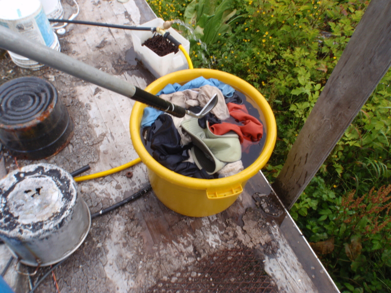 I slept in the next morning, and then hurried down to the Butedale Self-Serve Laundromat. (Self-serve in every way – the golf club agitator was hand powered.)