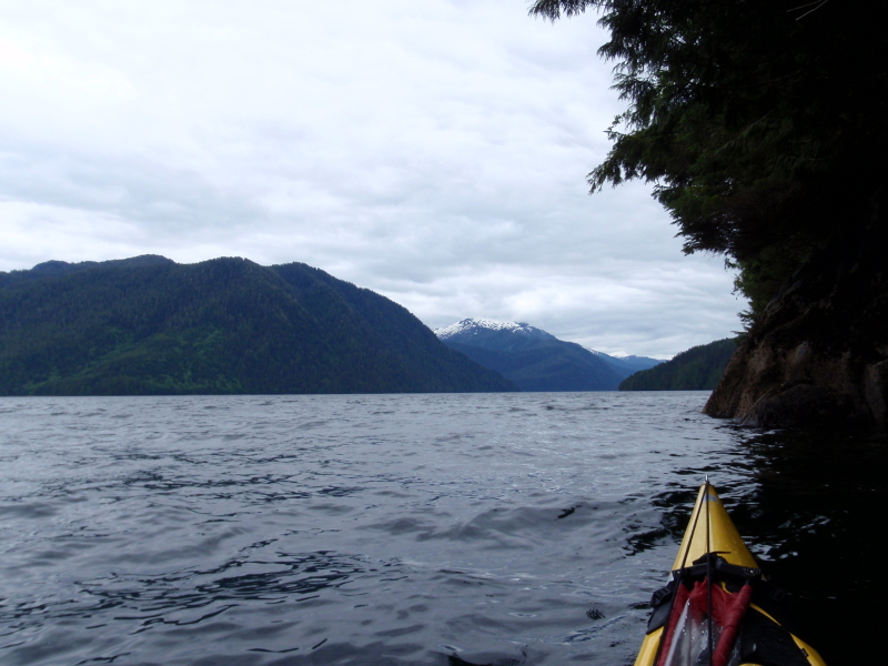 The day started warm and hazy – enough so that I put on sunscreen before my 10:15 launch. But by the time I reached the Canoona River at 13:30hrs, it was rainy and windy. No bears to be seen – just a couple of First Nations fishermen laying out a net from a skiff. I plugged against a brutal counter current as I passed Griffin Point.