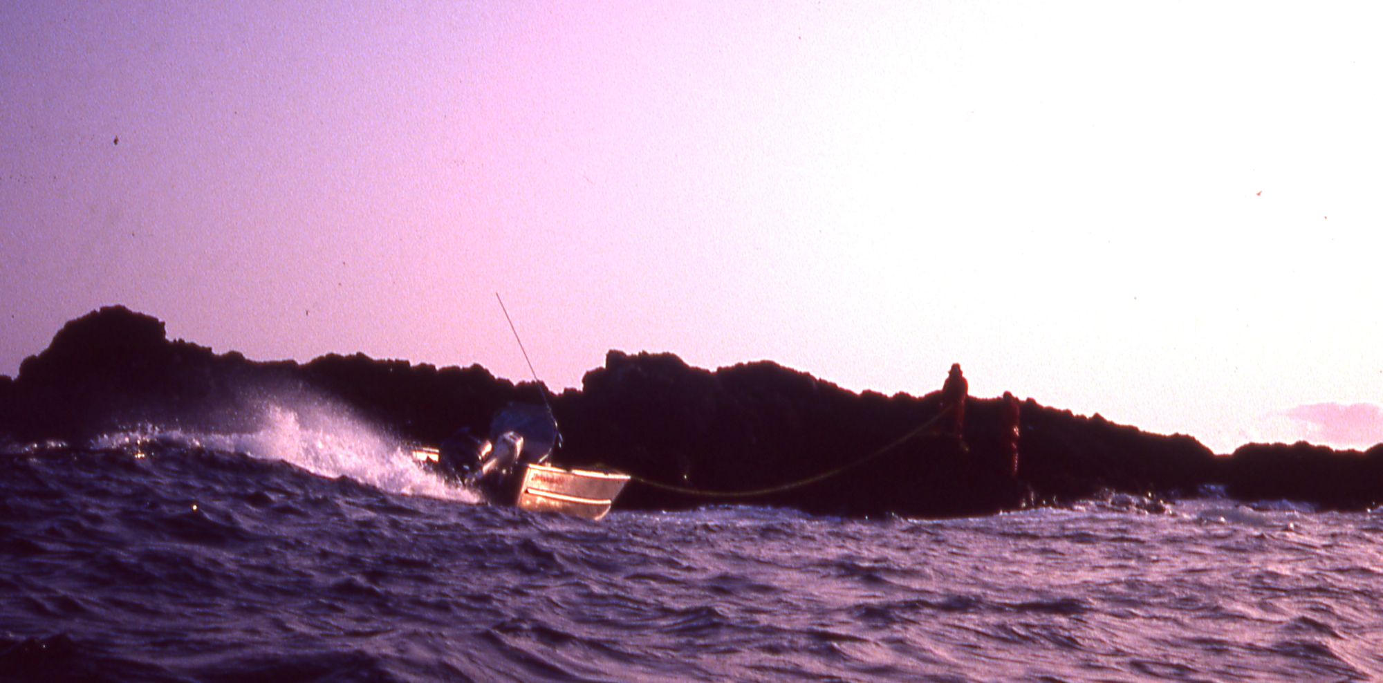 Nearing the reef, I spotted a couple of guys in bright red Mustang floater suits standing on the rocks, next to a collection of buckets. Thinking they might be marine biologists collecting samples, I shouted and waved. Their response was to literally turn their backs on me, though they must have seen and heard us. Oh well, if they’d wanted help, they would have asked. Besides, as we curved towards the northeast edge of the reef, we could see their stout little aluminum boat bobbing a couple of hundred feet offshore. They’d wisely dropped anchor a safe distance from the reef, motored close to hop ashore, then let the boat out on a line so it wouldn’t be relentlessly hammered against the rocks while they went about their mysterious business on the reef.