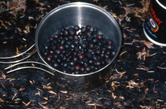 August 27, 1999 Up at a semi-respectable hour: 8:00AM. Encouraged by patches of sunlight, we picked berries to add to our morning pancakes, and enjoyed them in the sheltered and sun-dappled kitchen by the stream.