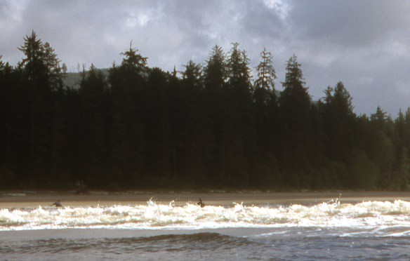 About 10:00AM, we neared the mouth of the San Josef river, and the break zone formed by incoming swells tripping over the outflowing stream. Stania spotted two kayakers in small “puddle jumper” boats near the southwest end of the bay (they were the only other paddlers we saw during our entire trip.) I naively suggested to her that we should watch where they re-entered the break, on the theory they must have paddled out through it and picked the best line. “Or,” the more worldly Stania pointed out, “they might have piss-all idea what they’re doing.”