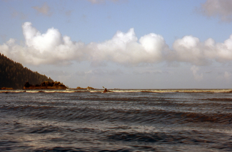 As we arced west of the cape’s most seaward point, we could see brown rocks and reefs flecked with foam. We also began to encounter the first really serious Pacific swells of the trip, at least two to three metres. It takes a little while to re-acclimatize to these moving mountains, especially when it’s been a year since you last paddled on the outer coast. Each swell is the height and shape of a house roof. You climb the face, then drop into the trough, where you are usually out of the wind, always out of sight of land, and often out of sight of your paddling partner.