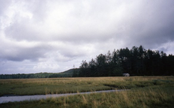 August 26, 1999 The wind blew strongly all day. With no particular reason to hurry, we did not have breakfast until 13:00 hours. I moved the tarp to a slightly more sheltered spot, and braced it with lines and driftwood log anchors. Fortunately the wind has been warm, and rather than driving rain, there’s only the occasional cloud of misty droplets. But it’s gusty enough that we’re getting cat’s paws even on the sheltered waters of the bay; what it must be like out on the open sea is hard to imagine.