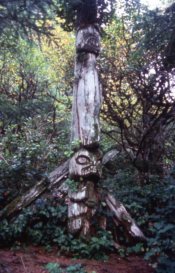 The next morning, Bob and co are up and launched early. I wave them a fond goodbye, but am happy to be on my own once more. On the mainland north of the Bunsbys I visit an ancient village site. The buildings have long since been absorbed back into the forest. Only broken crockery, rusted kettles, and a brooding totem pole remain.