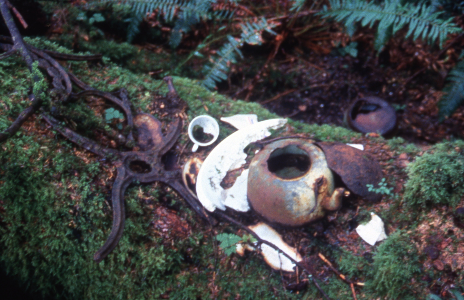 The next morning, Bob and co are up and launched early. I wave them a fond goodbye, but am happy to be on my own once more. On the mainland north of the Bunsbys I visit an ancient village site. The buildings have long since been absorbed back into the forest. Only broken crockery, rusted kettles, and a brooding totem pole remain.