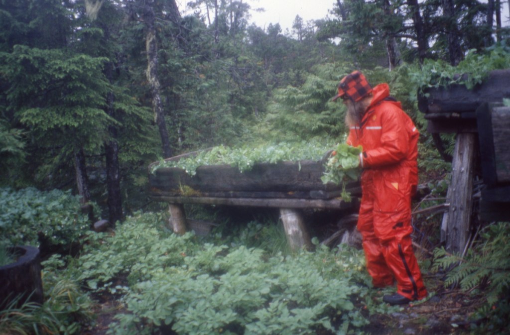 At the lake end of the path and stream, John keeps a small dinghy, for access to the two tiny islets where he gardens. (The lake serves as a moat against the deer that would otherwise graze him out of his hard-earned harvests.) In large, homemade, soil-filled bins he grows radishes, boy choy, collards and other veggies. He fertilizes the bins each year with seaweed. At his invitation, I picked some collards and parsnips for myself.