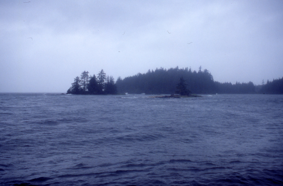 Full Gore-Tex pants and jacket is the rig of the day for any crew on deck or on the beach: the wind is whipping squalls and showers through on a regular basis. The tide has filled the little basin between my islet and Anger Island, with the water running through the narrow channel at Grade 2-3 whitewater at times.