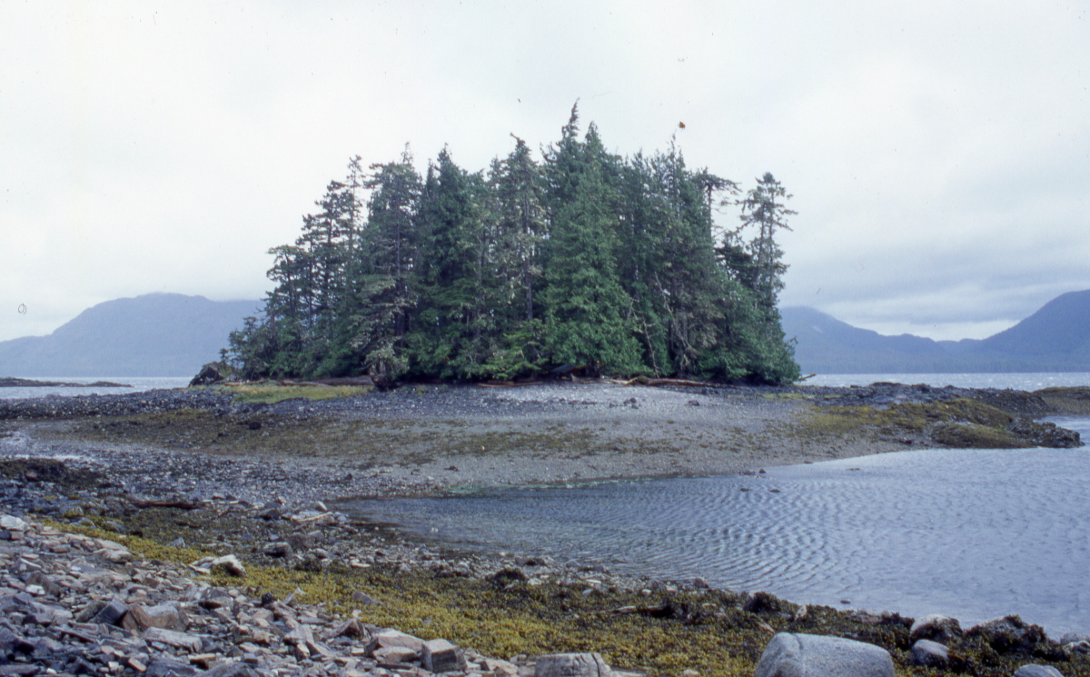 While I was cooking, I watched a mink prowl the intertidal zone, extracting something from behind a water-logged tree that did not want to accept his invitation to come for lunch. A crab, I’m assuming, but couldn’t be sure as the mink was facing away from me. The rain, which had confined itself to the occasional shower this morning, is falling steadily and heavily now. The barometer has risen slightly over the last six hours, so I’m hoping the 4:30PM forecast will bring news of some kind of break in the weather. Tomorrow’s tides would be perfect for me to get an early start out of the tidal basin behind the islet. I’d like to get into a proper pattern of early starts to beat the afternoon anabatic winds, and to paddle as many hours a day if possible. I’ve been doing some “back of the envelope” calculations of mileages, and figure if I have 10 days of good weather and put in longer days, I should be able to make Klemtu.