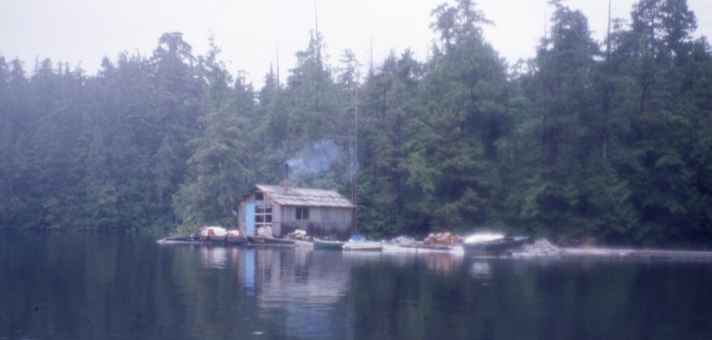 Later, I had a most unexpected pleasure: a visitor. A battered “tin” outboard came puttering ‘round the bend, piloted by a figure in an orange Mustang floater suit, looking like Santa Claus in his slimmer summer mode. John The Hermit (as he introduced himself) lives in an inlet just a bit south of here, having left Vancouver in the sixties when it lost too much of its hippy, counter-culture vibe for his taste. He’s a hydroelectrican of some sort, occasionally leaving his personal refuge to work briefly on one project or other up and down the coast to earn the little hard cash his lifestyle requires.