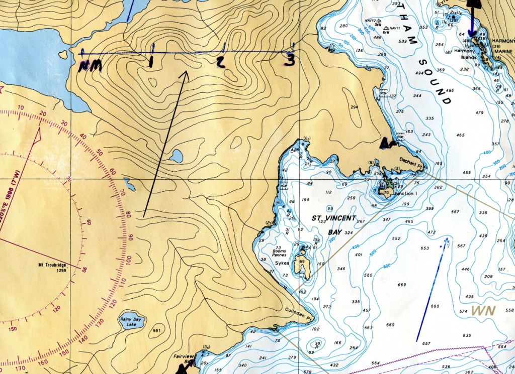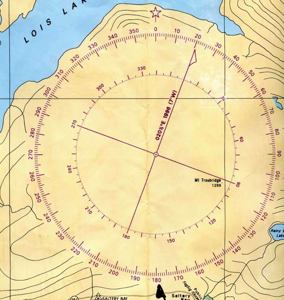 That first initialism, GUMA, tells us that if we’re going from ground (a magnetic bearing taken with our compass from an object in the real world) to the chart, we add variation to find the true North bearing. And vicey-versa with MUGS: if we’ve determined a bearing relative to true North on our chart, we subtract variation to find the magnetic bearing that will point to that location in the real world. (East of the agonic line, which runs through Ontario, the situation is reversed. You’re on your own for cunning rhymes there!)