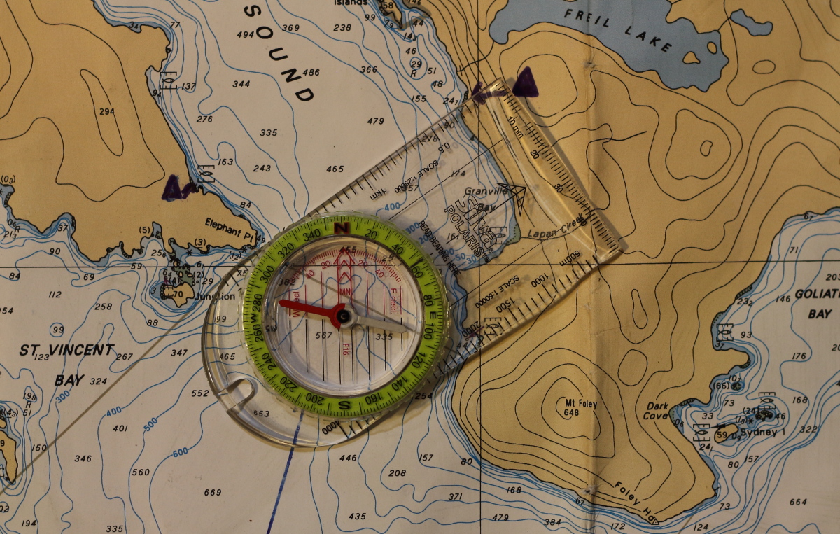 There are a couple of other benefits to having a protractor separate from your compass. Firstly, the degree readings are more widely spaced and less squinty to read than on the tiny bezel of a hiker’s compass. Secondly, it reduces confusion about what you’re using the instrument for. When I’m teaching navigation in-person or online, students using a hiker’s compass to determine a bearing on a chart often imagine they also have to orient the chart and/or get “Fred in the shed” to get an accurate reading. In fact, it doesn’t matter at all where the chart or or the compass needle are pointing; you’re only using the compass baseplate and bezel as a protractor to determine an angle relative to whichever North you’re working with.