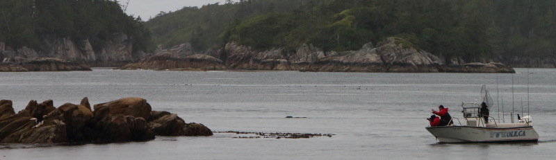 No wolves appeared during the day, but in late afternoon, I watched an eagle plunge to snatch up a salmon thrashing at the water’s surface. He’d just landed on the rocks to dine when a launch from one of the fishing lodges came peeling ’round the cape. Seemed they’d hooked that fish first. Whether it was an honest desire not to molest wildlife or the sight of me clicking away with my telephoto lens, they let the bird keep his ill-eagle catch.