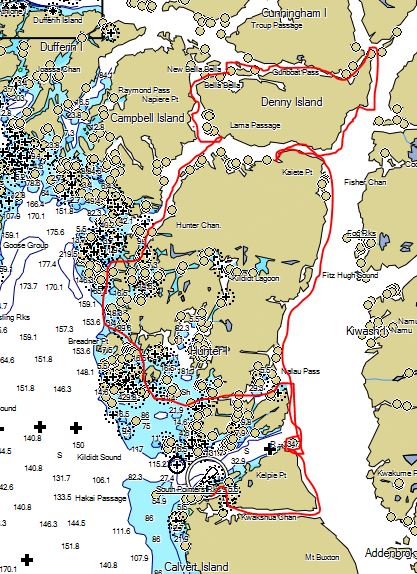 The very welcome break recharged me for clawing into the headwind funneling through Lama Passage between Hunter and Denny Islands. I finally landed at Serpent Point about 20:00 hours, after twelve and a half hours at sea and about 25 nautical miles of travel.