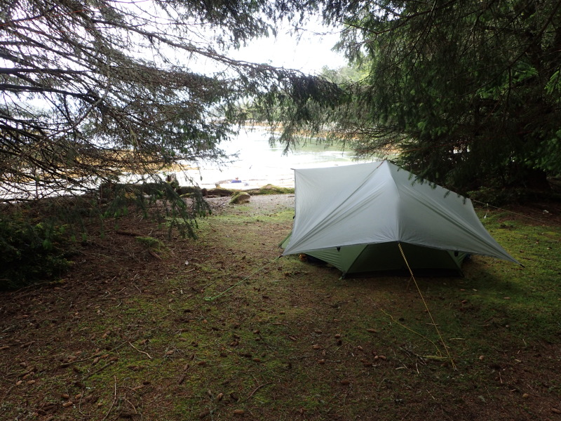 The sound of rain on the roof had me scuttling out of the tent at 5:45 to rescue my drysuit and long johns from the no-longer drying area. Then it was back to bed ’til about 9. I took advantage of a brief lull in the rain to select a suitable centre pole for my tarp from the driftwood offerings on the beach, and used my kayak mast to hold one edge high as an entrance.