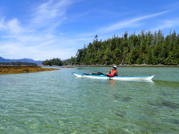 Approaching the tight gap formed by Maria Island, I was overtaken by a powerboat en route to Shearwater or Bella Bella. A white plume hung in its wake, and I was piously tut-tutting about exhaust fumes when a loud huff clued me in that I was actually looking at a whale spout. I hung about to watch the humpback blow steam once more. Then, with rainclouds cascading down the hills on the southeast side of Hampden Bay, I quickly pulled on my cag. Not for the first time, I was glad to have a waterproof layer I can don or doff at sea. It slipped on easily. Especially after I turned it the right way round.