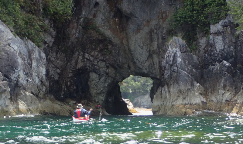 Peering back through the first of many sea arches, we spotted another group of kayakers taking a break on a beach, so we expected company back in camp that evening.
