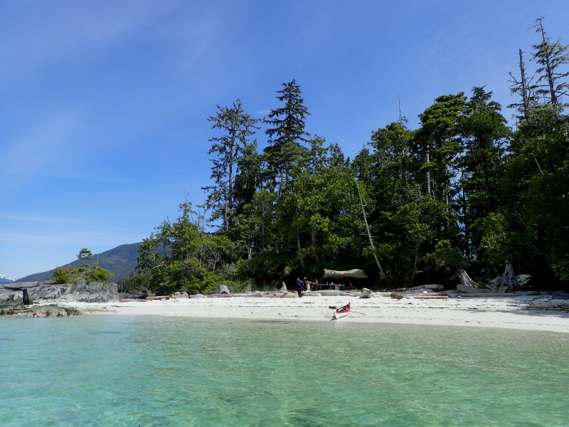 After yesterday’s epic paddle, I slept ’til nine, then began the slow, deliberate ritual of preparing brunch, now seasoned by a sharp, enjoyable hunger. Later, I inspected the “real” upland campsite on the west side of the little bay mentioned in The Wild Coast guidebook, but it’s become lumpy and overgrown since John Kimantas’ visit, so I opted to leave my tent at the head of the beach, albeit jammed between a pair of logs. I rewatered from the small creek, showered, and then updated the journal I’d been too tired to complete last night. I also fired up my phone on the off-chance I’d get a signal from Bella Bella or Shearwater and be able to make a reassuring call to home, but no luck.