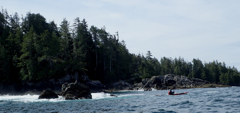 The oncoming swells grew larger and steeper as we got further west down Hammond Passage. We periodically lost sight of one another on opposite slopes of moving liquid mountains. At the Bordelais Islets, the most seaward rocks in the archipelago, great grey seas swept in, exploded impressively against the rocks, hurled geysers of foam into the air, then fell back like repelled invaders before renewing the endless assault. We arced well out to sea to avoid claptois reflecting off these rocky ramparts.