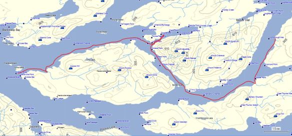 With the ferry not leaving `til late in the day, I was able to eat and pack leisurely, launching just before noon. I paddled the couple of hours to McLoughlin Bay and timed my landing for high tide around 14:00 hours.