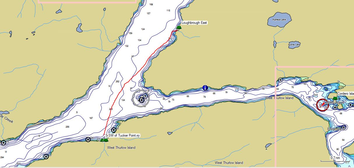 At first, I was guided mainly by the vague loom of the hills on the east side of Loughborough Inlet (to preserve my night vision, I didn’t keep the screen of my GPS lit constantly, firing it up only every several minutes.) But as I cleared Tucker Point, the slow, reassuring blink of the Lyall Island light hove into view, and gave me a constant reference angle.