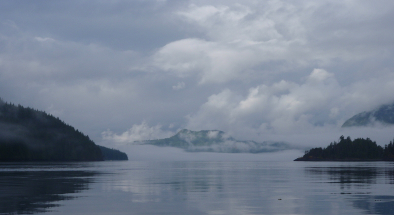 Up at 6AM. I paddled through calm waters and under low cloud up Sunderland Channel. Headwinds developed by the time I got to Althrop Point, which made me call off a planned visit to the head of Forward Harbour for grizzly watching (I’d also seen a sight-seeing boat deke rapidly in and out of the Harbour, which made me believe there were no grizzlies about).